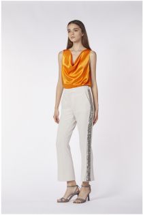 Un pantalón de tejido fluido y un refinado ribete de lentejuelas en las caderas enriquecen y embellecen la prenda haciéndola perfecta para una velada especial.