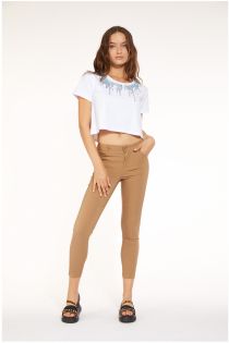 Pantalón básico con cinco bolsillos en tejido superstretch de viscosa elástico. Un modelo que sigue sinuosamente las líneas del cuerpo. No puede faltar en todos los tonos que componen la paletas de colores.