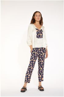 Cómodo pantalón en marocain de viscosa estampado. El cinturón elástico es en contraste