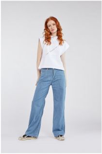 Suaves pantalones palazzo de tela chambray con pasamanería aplicada en las presillas. Adorna la prenda un elegante botón joya