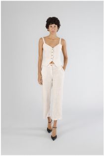 Pantalón elegante de pernera recta con vuelta fija en el bajo. modelo confeccionado en tejido de lino de raya diplomática. perfecta para llevar con su chaqueta a juego.