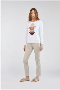 Pantalones chino atemporales en raso de algodón elástico. Una delicada aplicación de pasamanería de cuentas en el cinturón ilumina la prenda.