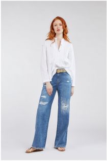 Pantalones de pernera ancha en tela denim no elástica adornados por un bordado que crea un efecto de parche colocado sobre las roturas decorativas.