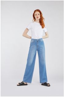 Pantalones Gina de pernera ancha en tela denim no elástica con bolsillos traseros no alineados que crean un particular contraste con el lavado principal de la prenda.