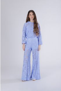 Pantalones palazzo de encaje con cintura elástica en la espalda elegantes y femeninos. el corte ancho estiliza la figura ofreciendo comodidad y estilo ideal para ropa formal de noche o looks sofisticados. la modelo mide 175 cm y usa talla s. corte: regular.
