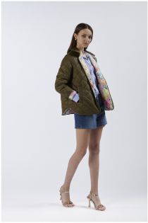 Plumífero con mangas cortas acolchado de rombos confeccionada en nailon impalpable con acabado mate. la prenda es reversible: por un lado un color liso y por el otro un estampado floral icónico de la colección de verano