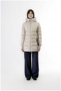 Plumífero con capucha fija confeccionado en tejido superligero con acabados en contraste brillo/mate. hasta la rodilla. versátil y práctico una prenda imprescindible en el armario de la nueva temporada otoño invierno.