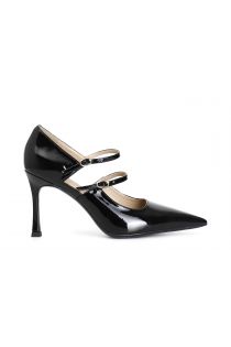 Salón de charol con un estilo elegante y femenino. zapato enriquecido con doble correa y hebilla. tacón fino de 87 mm de altura. forma delgada. el forro y la plantilla son de piel.