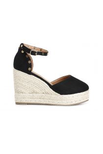 Sandalias de microfibra sobre cuña de cuerda de 10.5 cm y plataforma de 3.5 cm. correa en el tobillo. plantilla de piel. zapato cerrado por delante y por detrás. tachuelas doradas en la parte superior y en la correa.