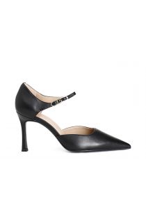 Escote dividido abierto lateralmente en la forma delgada de cuero con hebilla personalizada. tacón fino de 87 mm de altura. el forro y la plantilla son de piel. zapato de estilo elegante y femenino.