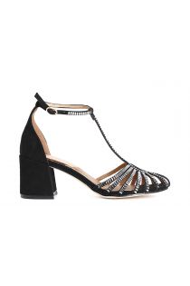 Sandalias de jaula en forma de «t» de microfibra y pedrería con tira en el tobillo y tacón h. 60 mm