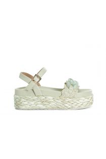 Sandalias color block de rafia tejida con accesorio de cadena de satén transparente. la plantilla es cómoda y la cuña está envuelta en rafia.