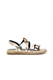 Sandalias asimétricas con accesorios de forma cuadrada de metal del mismo color que la pala. Como detalle la vira biselada de glitter.