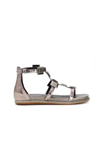 Sandalias cerradas detrás con accesorios de forma cuadrada de metal del mismo color que la pala. Como detalle la vira biselada de glitter.