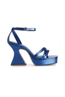 Sandalias de efecto laminado con tres bandas y elástico en la parte trasera. correa en el tobillo. tacón de carrete 90 mm de altura y plataforma. zapato cómodo caracterizado por su puntera cuadrada. parte superior sencilla y envolvente.