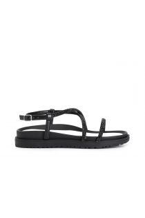 Sandalias cruzadas con pedrería construidas con un juego de tiras muy finas.