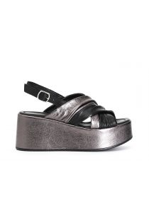 Sandalias cruzadas bicolor sobre cuña forrada de piel.
