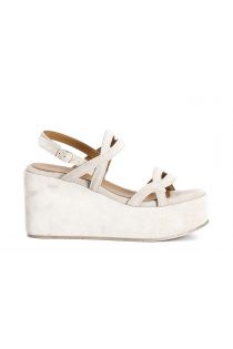 Sandalias de cuña de ante con dos bandas. la plantilla es de piel. la cuña tiene 9.5 cm de alto. un calzado que te hará sentir cómodo cada día. sin renunciar a tu estilo.