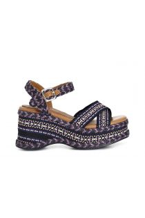 Sandalias con cruz étnica. cuña envuelta siempre en tejido étnico. la cómoda plantilla de cuero auténtico hace que el zapato sea cómodo incluso después de varias horas de uso. el tacón tiene 8 cm de altura mientras que la meseta tiene 4 cm.