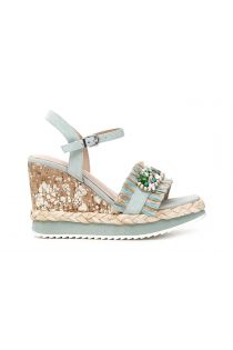 Sandalias de ante y rafia deshilachada de varios colores con accesorio de pedrería y cuentas en cuña de varios materiales.