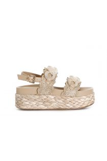 Sandalias de fraile color block con doble tira de rafia trenzada y accesorio de cadena transparente de satén. la plantilla es cómoda y la cuña está envuelta en rafia.
