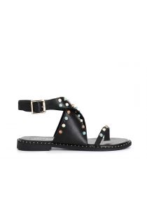 Sandalias de dedo con banda cruzada de piel con cabujón. el forro y la plantilla son de piel. el tacón tiene 2 cm de altura. cómodo de llevar y fácil de combinar.