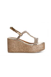 Sandalias con doble banda y motivo de pedrería. cuña forrada de rafia.