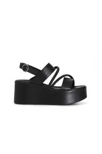 Sandalias de fraile con tiras de micropedrería sobre cuña forrada de piel.
