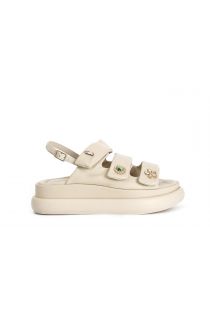 Sandalias de piel de tres tiras con velcro y botones joya. el forro y la plantilla son de piel. la cuña h. 4.5 cm. calzado perfecto para cada situación. ideal para tus aventuras en la playa pero también para un paseo por la ciudad. combinación perfecta entre elegancia y practicidad.