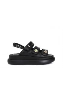 Sandalias de piel de tres tiras con velcro y botones joya. el forro y la plantilla son de piel. la cuña h. 4.5 cm. calzado perfecto para cada situación. ideal para tus aventuras en la playa pero también para un paseo por la ciudad. combinación perfecta entre elegancia y practicidad.