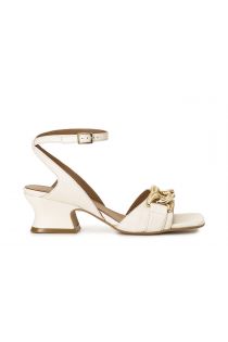 Sandalias de piel con tira en el tobillo y accesorio de cadena dorada. tacón de carrete.