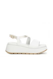 Sandalias de piel bicolor con tira asimétrica sobre cuña.