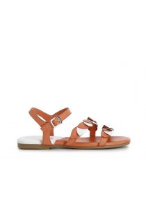 Sandalias bajas de piel con doble banda modelo gilda y decoración frontal bicolor que recuerda un entrelazado de hojas.