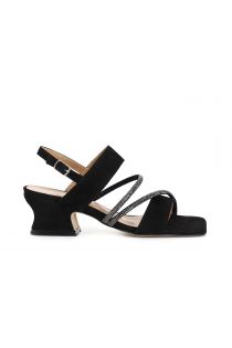 Sandalias de fraile con dos bandas de ante y dos tiras de micropedrería. tacón de carrete.