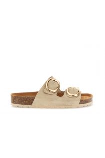 Sandalias estilo pantuflas con doble tira de ante suave adornadas con grandes hebillas redondas doradas. la plantilla anatómica garantiza comodidad y sujeción durante todo el día mientras que la suela de corcho y goma de 3 cm garantiza ligereza y estabilidad. perfectas para un look informal sofisticado.