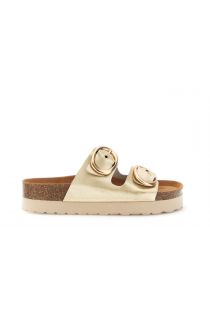 Sandalias de doble tira con hebillas metálicas decorativas. cuentan con una parte superior de cuero laminado. la plantilla anatómica garantiza comodidad y sujeción durante todo el día mientras que la suela de corcho y goma de 4 cm garantiza una estabilidad ligera. cómodas estables e ideales para el día a día.