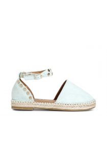 Sandalias cerradas por detrás y con tira en el tobillo de tela con tachuelas sobre base de cuerda.