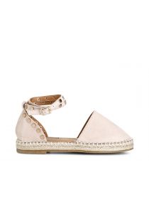 Sandalias cerradas por detrás y con tira en el tobillo de tela con tachuelas sobre base de cuerda.