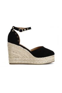 Sandalias de tela con cuña de esparto y plataforma. cinturón de tela en el tobillo. zapato cerrado delante y detrás. tachuelas doradas en el refuerzo y la correa.