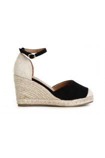 Sandalias de tela en cuña de esparto. cinturón de tela en el tobillo. zapato cerrado delante y detrás.