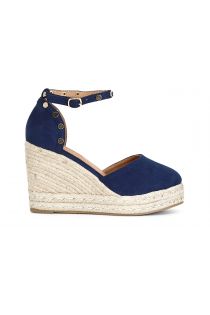 Sandalias de cuña de esparto con tira de tela en el tobillo cerradas por delante y por detrás con tachuelas doradas.