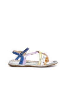 Sandalias bajas de piel sintética laminada con tejido multicolor.