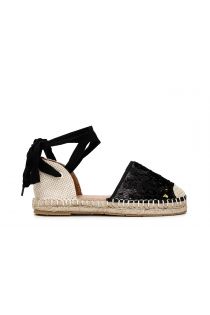 Sandalias en tejido con lentejuelas con lazo en el tobillo en fondo de esparto bajo