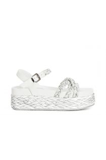 Sandalias gilda color block con tres bandas de rafia entrelazadas y una inserción de pedrería. la plantilla es cómoda y la cuña está envuelta en rafia.