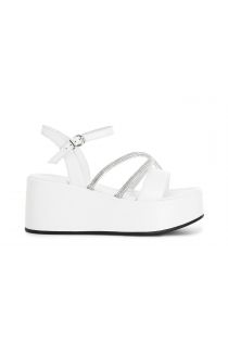 Sandalias modelo gilda con tiras de micropedrería sobre cuña forrada de piel.