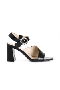 Sandalias asimétricas de charol modelo guilda. correa de tobillo ajustable con hebilla. corte forro y plantilla son de piel. tacón ancho de 8.5 cm de altura. zapato elegante estiloso y formal.