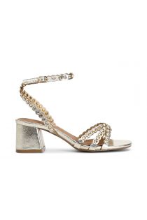 Sandalias efecto metalizado con pedrería. tacón medio. cinturón y hebilla ajustables en el tobillo.