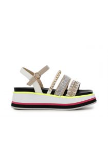 Sandalias multi-tiras con cadena y pedrería, suela en micro multi-capas de color y cómodo lecho del pie.