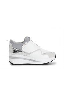 Silp-on de piel acompañado con inserciones laminadas y una banda elástica para facilitar el ajuste. suela alzada bicolor con logotipo en relieve.