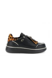 Zapatillas de piel sin cordones con detalle de flecos de piel con efecto poni moteado y accesorio joya. Logotipo lateral con monograma Café Noir. Forro de tela y plantilla de piel. Suela de plataforma de 4 cm para un estilo glamuroso y cómodo.